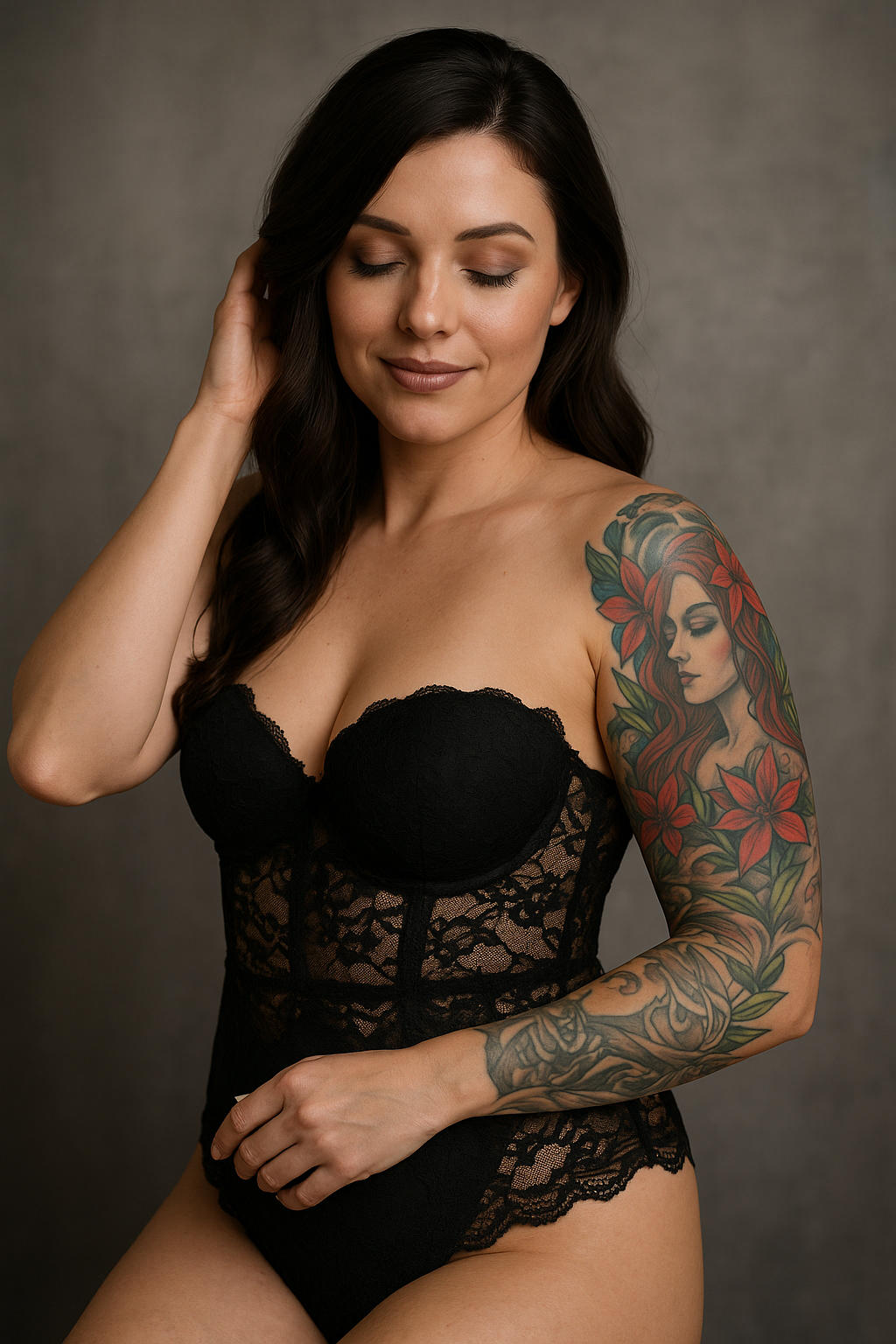 Choosing the right lingerie or outfit can enhance your tattoos beautifully. A strapless bodysuit may show off shoulder art, while delicate lingerie can highlight hip or thigh tattoos. During your session, we’ll experiment with styling and posing that draws attention to your favourite pieces, making your tattoos part of the visual story.
